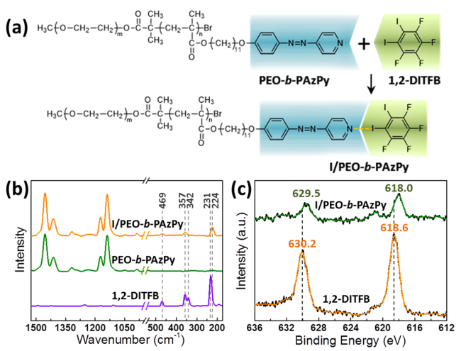 圖1. (a)鹵鍵復合物I/PEO-b-PAzPy的化學結構;鹵鍵的表征:(b)拉曼光譜與(c)X射線光電子能譜(XPS)