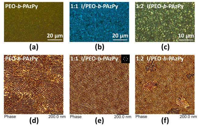 圖2. 原嵌段共聚物與鹵鍵復合物的織構與微相分離結構。(a-c)、(d-f)分別為純嵌段共聚物、不同化學計量比鹵鍵復合物(1,2-DITFB與AzPy基團的摩爾比分別為1:1與1:2)的偏光顯微鏡(POM)與原子力顯微鏡(AFM)圖。