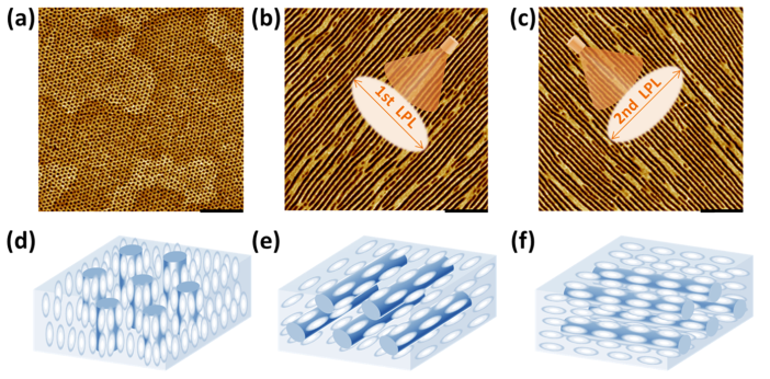 圖3. 鹵鍵超分子液晶嵌段共聚物薄膜中超分子液晶基元與微相分離結構的光取向。(a-c)、(d-f)分別為三種狀態下鹵鍵復合物薄膜的AFM圖,薄膜中超分子液晶基元與PEO納米柱的排布示意圖:(a、d)液晶溫度下退火后;(b、e)460 nm線偏光初次輻照后;(c、f)與初次線偏光偏振方向垂直的線偏光再次輻照后。