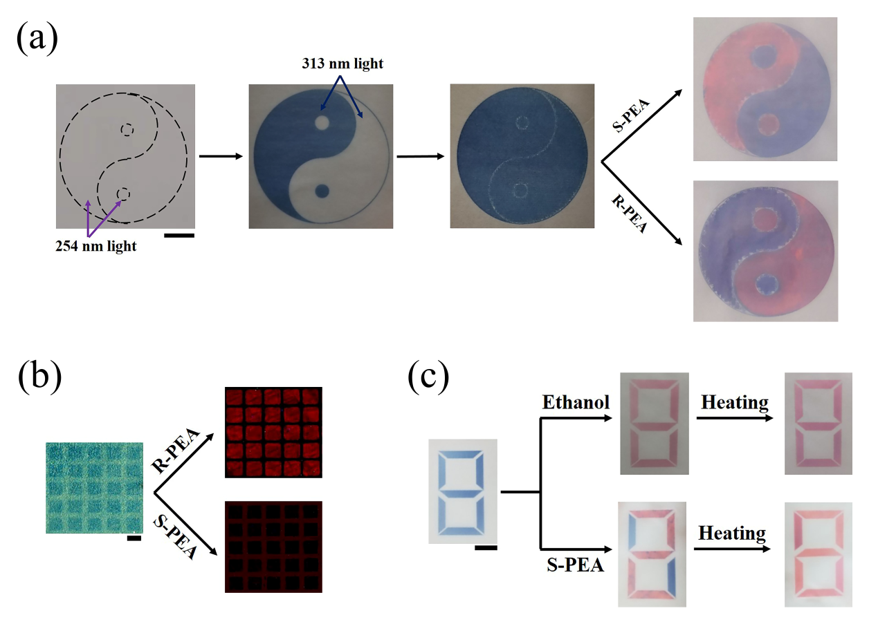 圖2. (a)手性太極圖案的制備及對映選擇性識別;(b)最小分辨率為5 μm的手性陣列圖案顯微鏡照片;(c)信息加密圖案。