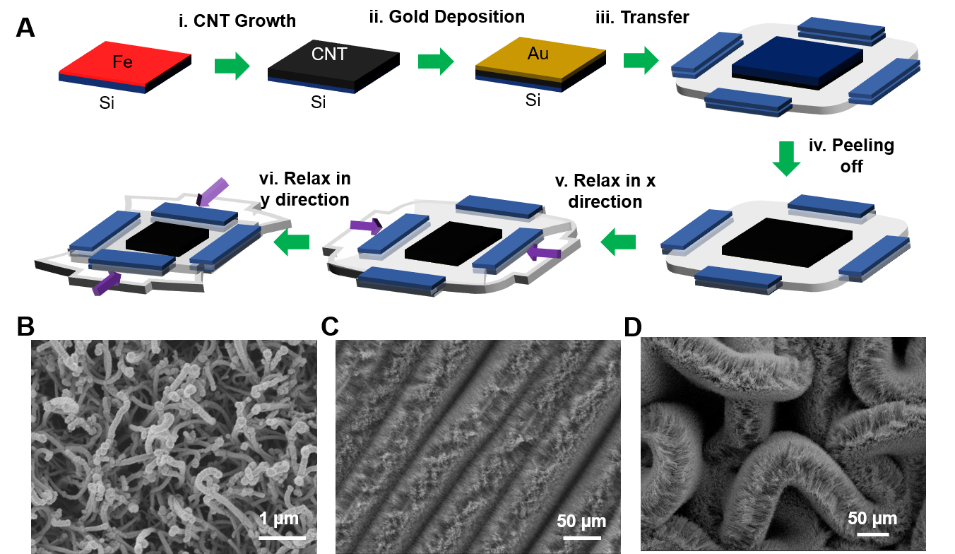 圖1:基于褶皺Au-CNT-forest的可拉伸電極的制備和表征。