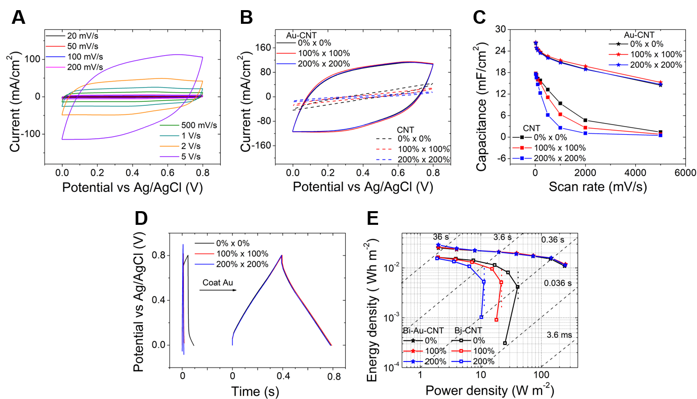圖3:雙向可拉伸Au-CNT-Forest 電極的電化學(xué)性能。