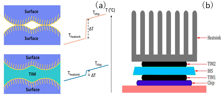 圖2:( a)熱界面材料 (TIM)填充界面空隙,增加有效接觸面積 ( b)熱界面材料 (TIM)實際導熱示意圖