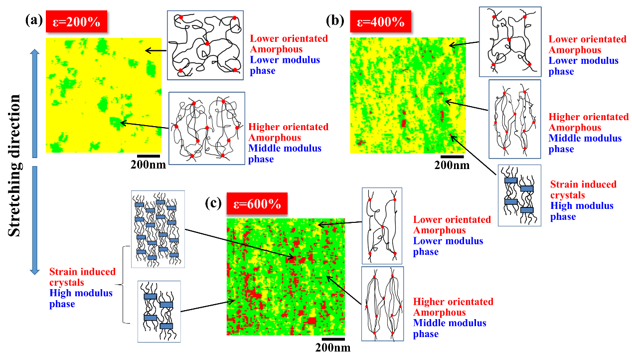 天然橡膠(NR)獨特的應變誘導結晶性能,賦予了它高的拉伸、撕列強度,以及優異的抵抗裂紋增長性,使其成為發展高性能橡膠制品的首選橡膠原材料。關于NR應變誘導結晶的相關研究已有很多,北京化工大學盧詠來教授團隊長期致力于NR應變誘導結晶的相關研究,前期采用WAXD結合偏振紅外技術探究了環氧化作用對NR應變誘導結晶的影響規律(Macromolecular Rapid Communications, 2019, 40(14), 1900042);采用WAXD技術和毛細管膨脹計研究了NR/IR共混體系的應變誘導結晶過程和結構變化規律(Plastics Rubber & Composites, 2017, 46(7):290-300)。雖然X射線衍射技術是目前最為常用和有效的表征NR應變誘導結晶的技術手段,但其只能從倒易空間角度,得到諸如結晶度,取向度,晶胞參數等信息,結晶結構的獲得需要公式進行轉化,對結晶模型的推測缺乏直觀證據。原子力顯微鏡(AFM)技術由于可以直接追蹤材料變形過程中微觀結構的變化,近年來也被應用于觀測NR應變誘導結晶。通過AFM的表征可以實現NR拉伸過程中微觀結構演變的可視化,同時結合AFM的力學性能分析功能可進一步分析其自增強機理。然而,拉伸過程中自增強橡膠體系極為復雜,包含了無定形區,取向無定形區和結晶區。目前AFM技術直接得到的結果無法實現對拉伸過程中各相態結構的準確識別及定量分析。