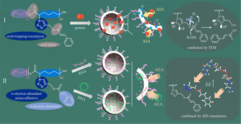 同濟大學杜建忠教授提出了高效包載蛋白和核酸的高分子囊泡構建原理:“酸誘導吸附”(Acid-induced adsorption, AIA)和“親和強化吸引”(Affinity-enhanced attraction, AEA)(圖 1、圖 2)。
