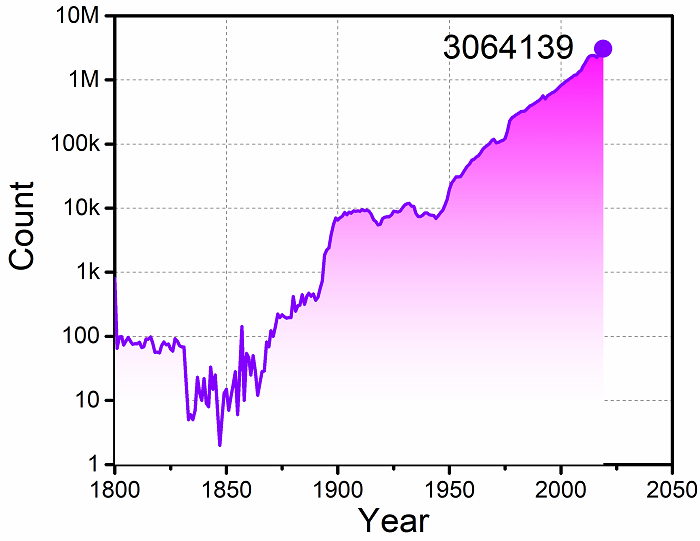 “材料”是人類(lèi)生活和生產(chǎn)的物質(zhì)基礎(chǔ),是人類(lèi)認(rèn)識(shí)自然和改造自然的工具。人類(lèi)社會(huì)的發(fā)展歷程也是以“材料”為主要標(biāo)志的。近年來(lái),材料科學(xué)得到了快速的發(fā)展,論文發(fā)表量快速突破每年100萬(wàn)篇(圖1),而“材料學(xué)者”的數(shù)量也從18世紀(jì)的寥寥百人急劇增長(zhǎng)到2019年的300+萬(wàn)(圖2)。那么,誰(shuí)才是最優(yōu)秀的材料科學(xué)家呢?一個(gè)最為知名的榜單就是“科睿唯安”發(fā)布的“高被引學(xué)者排名”,但僅僅采用“引用次數(shù)”來(lái)評(píng)價(jià)科學(xué)家既不科學(xué)也不完美。