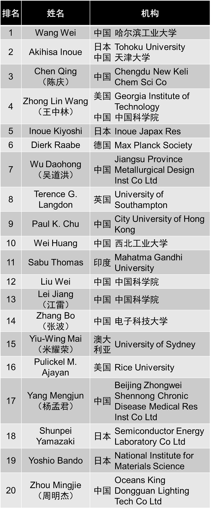 在“Microsoft Academic”的數(shù)據(jù)庫(kù)中,發(fā)表論文量中包含研究論文與專(zhuān)利,因此很多排名靠前的“材料學(xué)者”是專(zhuān)利大戶。
