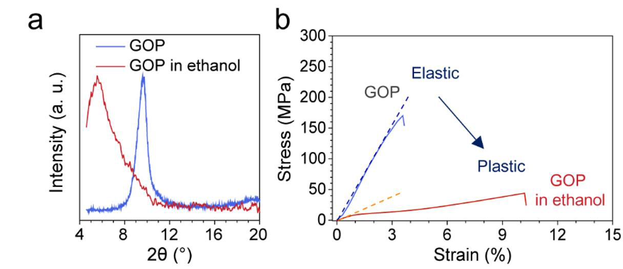 圖二. 氧化石墨烯膜的脆性-塑性轉(zhuǎn)變. a 氧化石墨烯膜塑化前后的XRD;b 塑化前后氧化石墨烯膜的典型力學(xué)曲線.