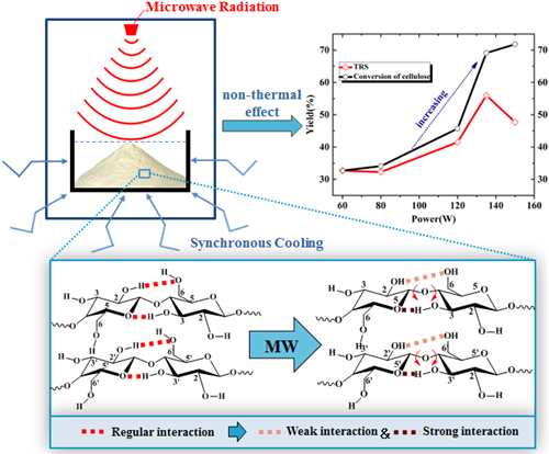 團隊通過包含“去結晶”與“再水解”的“兩步法”水解路線的構建,成功去除了由纖維素分子鏈超強自聚集本性引導形成的初始“頑固”結構,明顯提升了纖維素的水解可及性,促進了糖產物產率及選擇性的提升,尤其在微波驅動水解中取得了較好的水解效果(Bioresource Technol., 2013,137: 106-110)。在此基礎上,通過水解體系與驅動方法的設計優化對纖維素水解可及性及響應速度進行調控。在富含極性非質子溶劑環丁砜的水解體系中,利用環丁砜與纖維素分子鏈上羥基間的吸附作用,成功實現了對再生纖維素因分子鏈自聚集產生的自發再次結晶的控制,抑制了結晶結構更加完善的I型結晶的產生,同時引導相對水解響應能力更高的II型結晶的形成,進一步提升了纖維素的水解可及性與效率(ACS Sustain. Chem. Eng., 2016, 4: 1507-1511)。在新型微波驅動方式方面,成功開發了帶有同步冷卻的微波驅動方法,在適宜恒定的反應溫度下,有效強化了微波非熱效應,由此對纖維素分子鏈間相互作用及再次結晶能力進行調控,促進水解成糖效率的進一步提高(Carbohydrate Polym., 2018, 197: 414-421),如圖1。