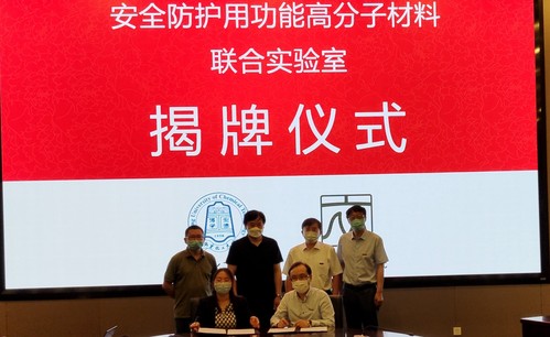 北京化工大學材料學院先進彈性體材料研究中心主任盧詠來教授與北京服裝學院材料設計與工程學院副院長張秀芹教授簽署了合作協議。兩校校領導共同為聯合實驗室揭牌。北京化工大學科發院朱保寧,北京服裝學院科技處副處長張玉芳、國內合作與校友工作處副處長續延以及材料設計與工程學院全體領導班子參加了儀式。北京化工大學王峰副校長和張立群副校長還共同參觀了聯合實驗室的防護口罩驗證生產線。