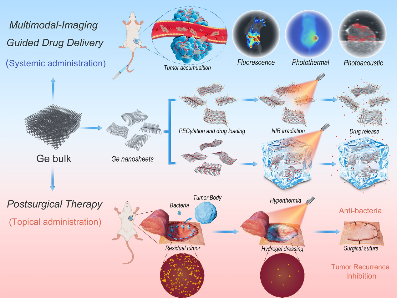 這項研究中,作者首次提供了基于鍺烯納米薄片(Ge NSs)的實體腫瘤手術輔助治療系統:(i)多模態成像引導下全身給藥發揮術前新輔助治療潛能,(ii)基于鍺烯的水凝膠實現術后原位治療腫瘤復發和抑制傷口感染。剝落的Ge納米片(NSs)表現出高載藥量,多響應(pH和近紅外[NIR]敏感)化療藥物釋放行為,NIR觸發的深部腫瘤滲透性能,良好的生物相容性以及多模式成像引導的腫瘤新輔助治療的潛力。當與水凝膠(由FDA批準的瓊脂糖和殼聚糖組成)結合后,將含有載藥Ge的水凝膠涂在腫瘤術后傷口表面,通過NIR照射,發揮局部熱療和NIR觸發的化療藥物釋放的作用,一方面能夠快速殺滅殘留腫瘤細胞和細菌,另一方面持久抗腫瘤、抑菌并加速傷口愈合。