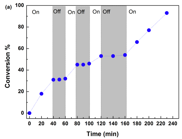 圖3. (a)MMA單體轉化率隨時間變化的圖線,(b)65℃溫度條件,白色LED燈照射下分子量和分子量分布(實心代表有光照射時,空心代表無光照射時)隨單體轉化率的變化