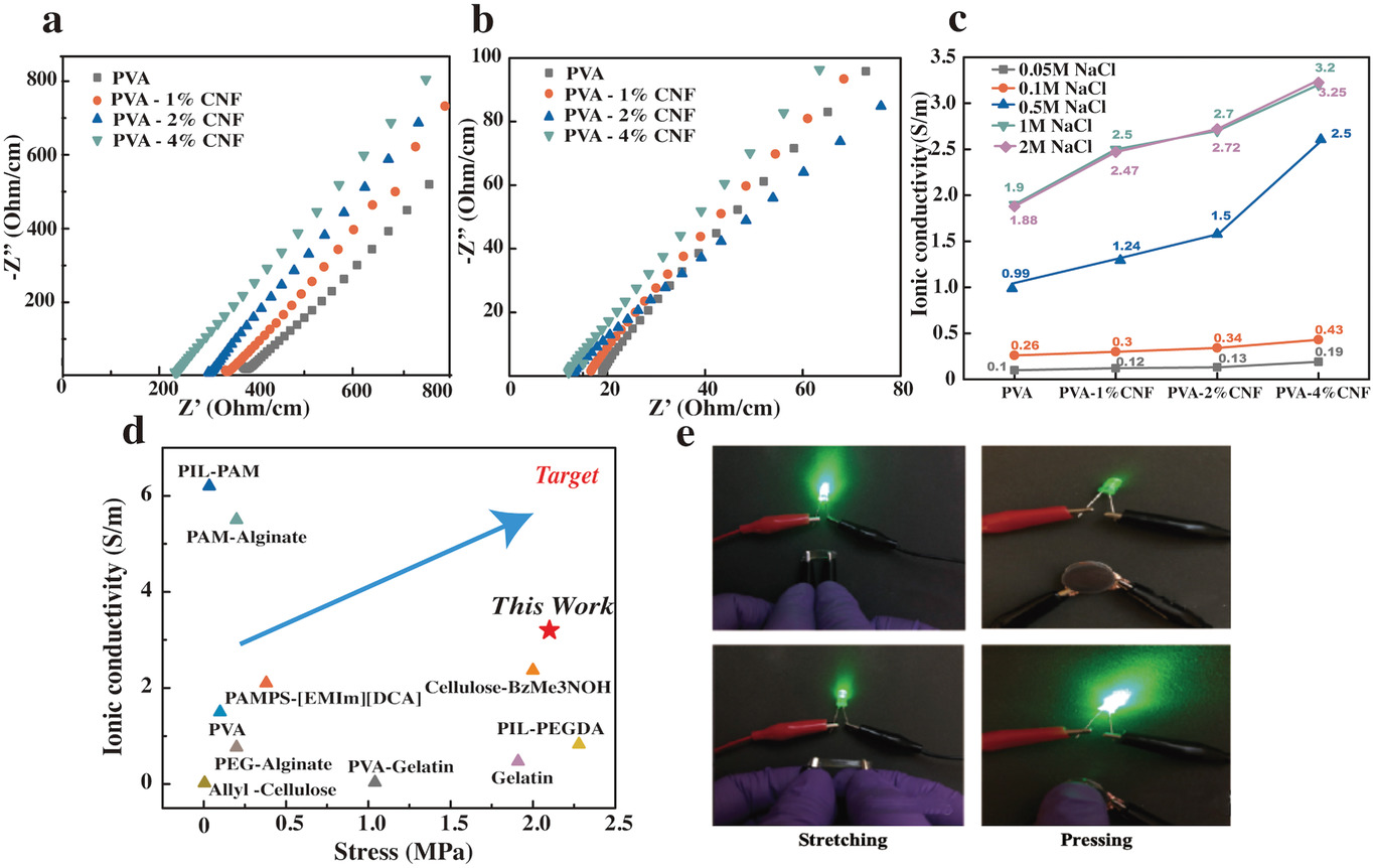 PVA作為無毒綠色的高分子為凝膠系統提供了良好的機械性能基礎,CNF較強的氫鍵作用及其本身較高的模量使其在復合凝膠中起到出色的力學增強作用。因此,制備的有機水凝膠具備較高的拉伸強度(2.1MPa),斷裂伸長率(660%),以及韌性(5.25 MJ/m3)。一般來說,由于凝膠內部離子遷移受到高分子交聯作用的阻撓,高強度的凝膠通常具有較低離子電導率。本文作者采用TEMPO氧化使CNF表面羧基化從而帶有良好的負電性,其帶電表面能促進離子的移動和增加離子電導率。實驗結果表明,有機水凝膠的離子電導率隨著CNF的添加量的增加而提高。當CNF的含量為4%時,其離子電導率可以達到3.2 S/m。CNF促進離子電導率的機理可歸因于以下因素。其一,CNF的引入可以讓凝膠本身形成多等級層次化結構,從而提供更多的表面積用于離子移動。此外, CNF表面豐富的羧基會吸引更多反離子,為離子轉移提供更多的跳躍位點。