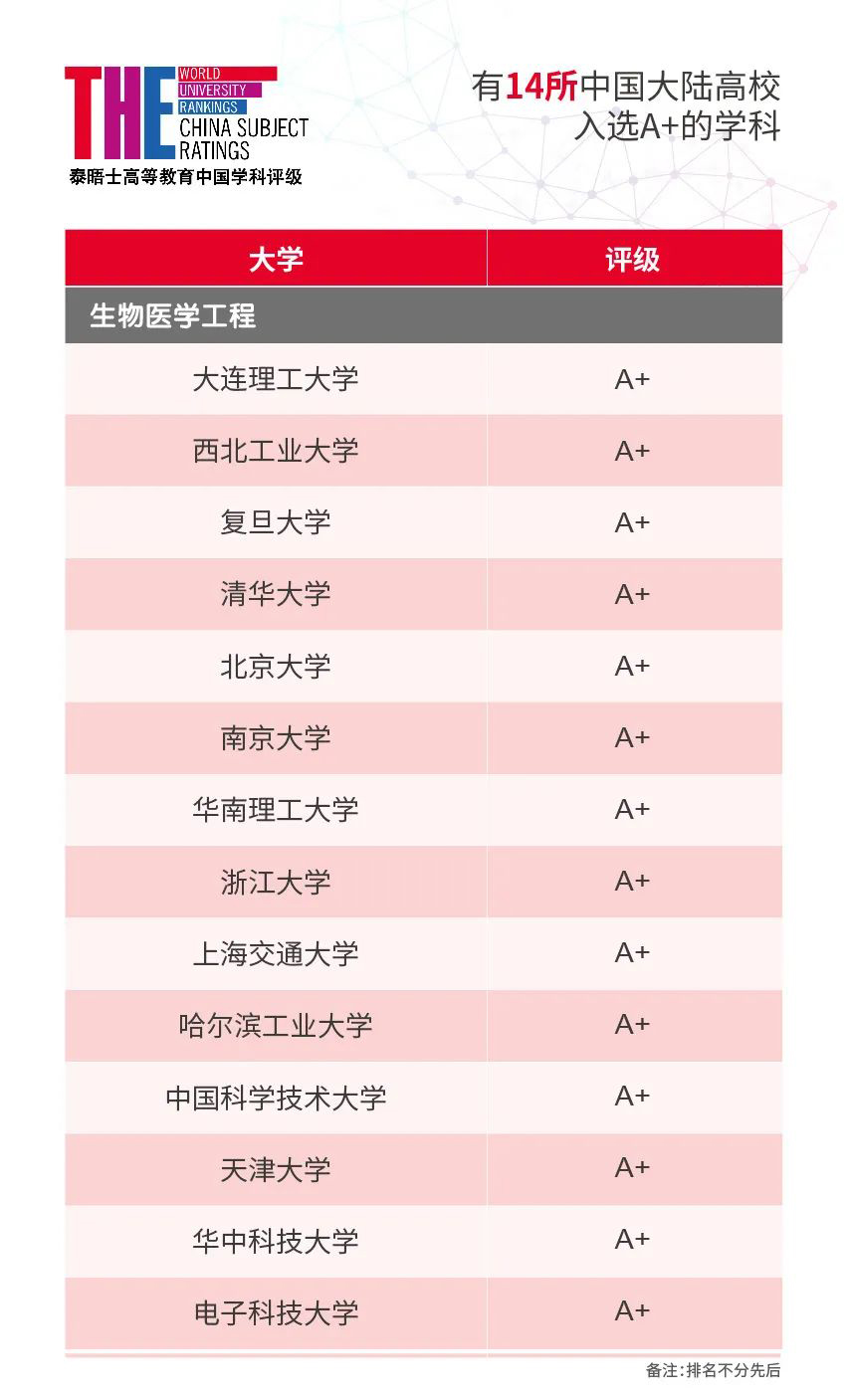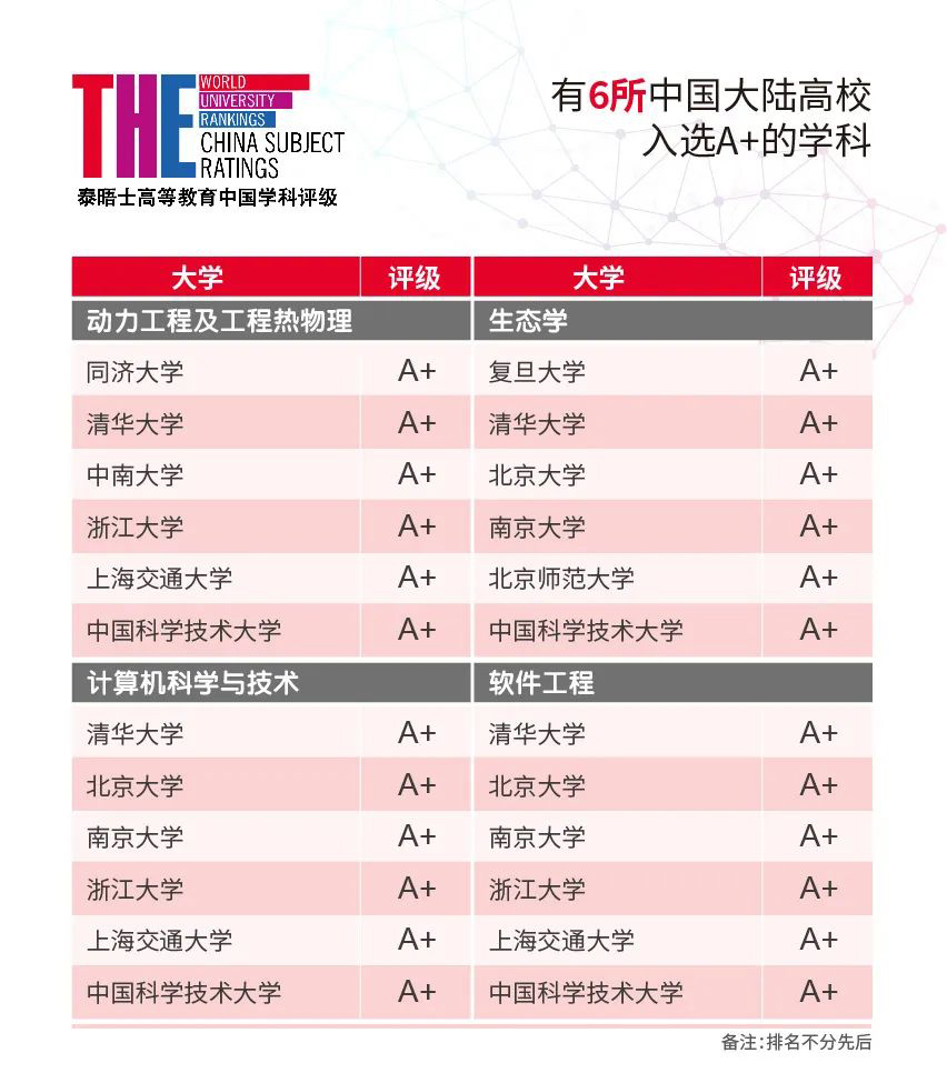 每個學科被評為A+的中國大陸高校如下: