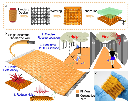 中科院北京納米能源與系統研究所王中林院士課題組與廈門大學郭文熹副教授、東華大學汪軍教授等合作,發表了可機械化生產的3D蜂巢組織阻燃摩擦納米發電織物的工作。利用連續空芯錠花式捻線機技術,提出了一種基于阻燃包纏紗的3D蜂巢組織摩擦納米發電的機織物。該包纏紗加工技術與紡織機械生產工藝兼容性好,參數可控,可產業化生產。基于此包纏紗產生的自供電織物可作為智能地毯,用作自供電的逃生和救援系統。該系統可以精確地定位幸存者所在位置并指出逃生路線,以便及時協助幸存者搜尋和營救。同時,該自供電織物可作為室內裝飾,蜂巢組織結構的獨特設計賦予該織物出色的降噪能力。此外,結合其良好的機洗性,透氣性,阻燃性,耐用性和可重復性。其在消防救援和可穿戴傳感器以及智能家居裝飾中可能具有巨大的應用前景。