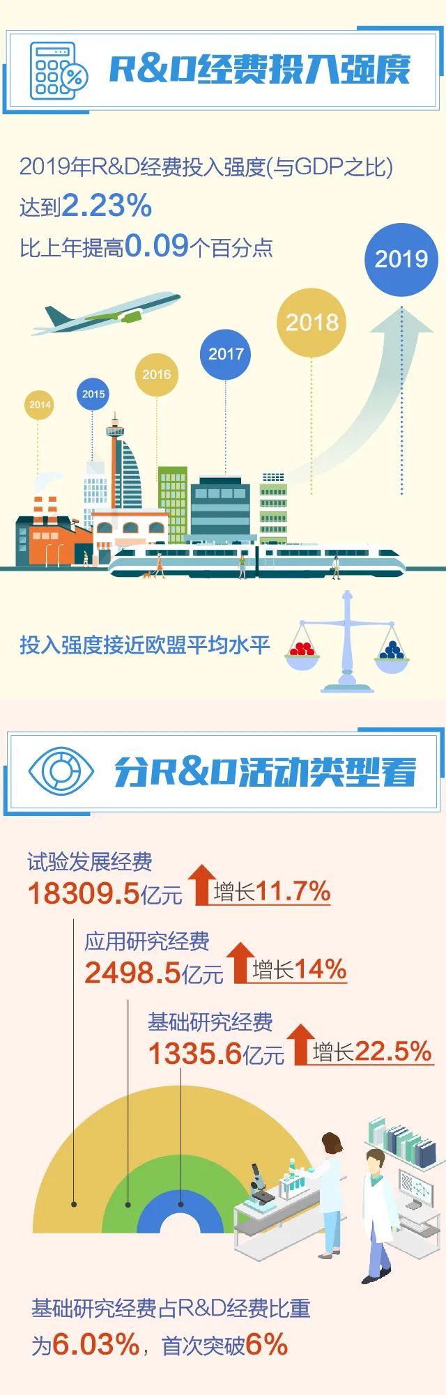 2019年,全國共投入研究與試驗發展(R&D)經費22143.6億元,比上年增加2465.7億元,增長12.5%;研究與試驗發展(R&D)經費投入強度(與國內生產總值[2]之比)為2.23%,比上年提高0.09個百分點[3]。按研究與試驗發展(R&D)人員全時工作量計算的人均經費為46.1萬元,比上年增加1.2萬元。