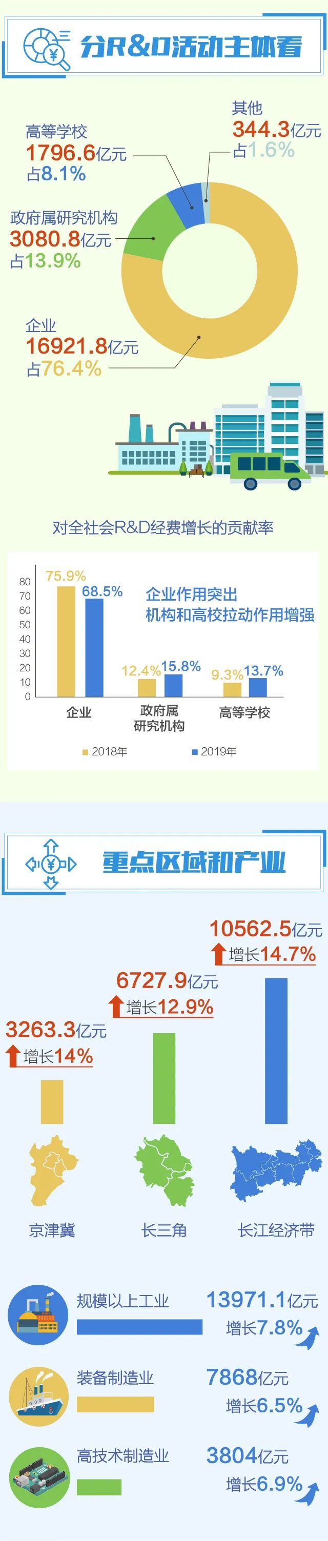 分活動主體看,各類企業研究與試驗發展(R&D)經費支出16921.8億元,比上年增長11.1%;政府屬研究機構經費支出3080.8億元,增長14.5%;高等學校經費支出1796.6億元,增長23.2%。企業、政府屬研究機構、高等學校經費支出所占比重分別為76.4%、13.9%和8.1%。