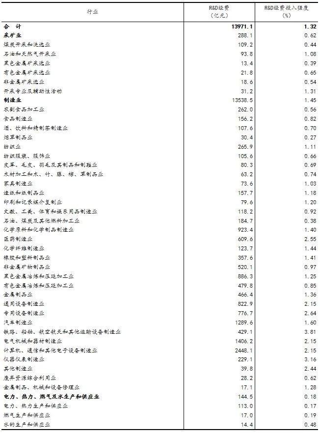 分產業部門看,高技術制造業研究與試驗發展(R&D)經費3804.0億元,投入強度(與營業收入之比)為2.41%,比上年提高0.14個百分點;裝備制造業研究與試驗發展(R&D)經費7868.0億元,投入強度為2.07%,比上年提高0.16個百分點。在規模以上工業企業中,研究與試驗發展(R&D)經費投入超過500億元的行業大類有9個,這9個行業的經費占全部規模以上工業企業研究與試驗發展(R&D)經費的比重為69.3%(詳見附表1)。