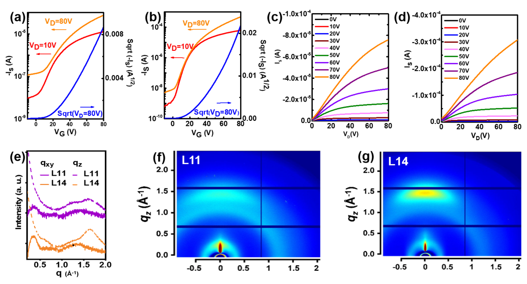圖3. (a-d) n型高分子受體材料L11和L14在有機場效應晶體管器件中的轉移和輸出曲線; (e-f) L11和L14高分子薄膜的一維和二維掠入射廣角X射線散射(GIWAXS)圖。