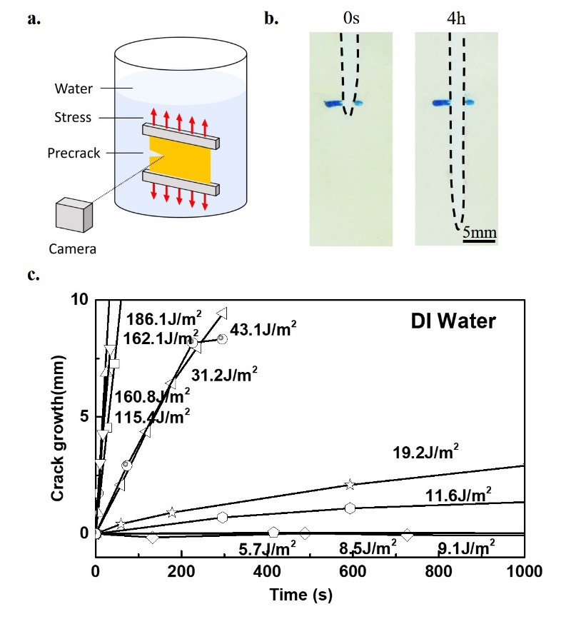 圖1:在DI水中,PGS遭受應力腐蝕開裂。a. PGS試樣預先切一個裂紋,拉伸到一定程度,沒入DI水中,用相機觀察裂紋的長度變化。b. 在施加能量釋放率19.2J/m2, 裂紋4小時內擴展了3.5cm. c. 裂紋擴展與時間的關系,每一條線代表不同能量釋放率下裂紋的擴展。