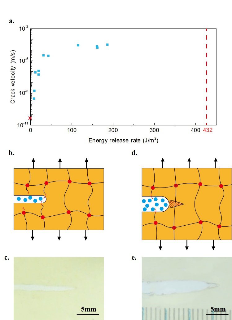 圖2. 裂紋擴展與能量釋放率的關系a. 在DI水中,不同能量釋放率下測得的裂紋擴展速度。b. c. 裂紋擴展速度隨能量釋放率變化區域的示意圖與照片。d. e. 裂紋擴展速度不隨能量釋放率變化區域的示意圖和照片。在裂紋尖端出現一層區域,阻止水擴散至裂紋尖端。