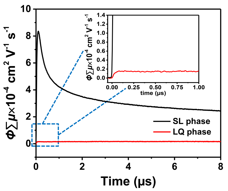 圖5. C7-C8-C60薄膜在SL相(黑線)和高溫相(紅線)時0-8 μs內的瞬態(tài)電子遷移率。