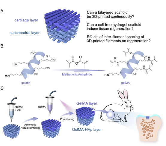 復旦大學聚合物分子工程國家重點實驗室主任丁建東教授與實驗室PI、上海華山醫院陳世益教授合作,利用3D打印技術,一步法連續構建雙層多孔水凝膠支架,在沒有負載外源性細胞或生長因子的情況下,成功地誘導骨軟骨組織修復再生,并發現溶脹的水凝膠支架的孔隙和力學性能對組織修復再生有重要影響。