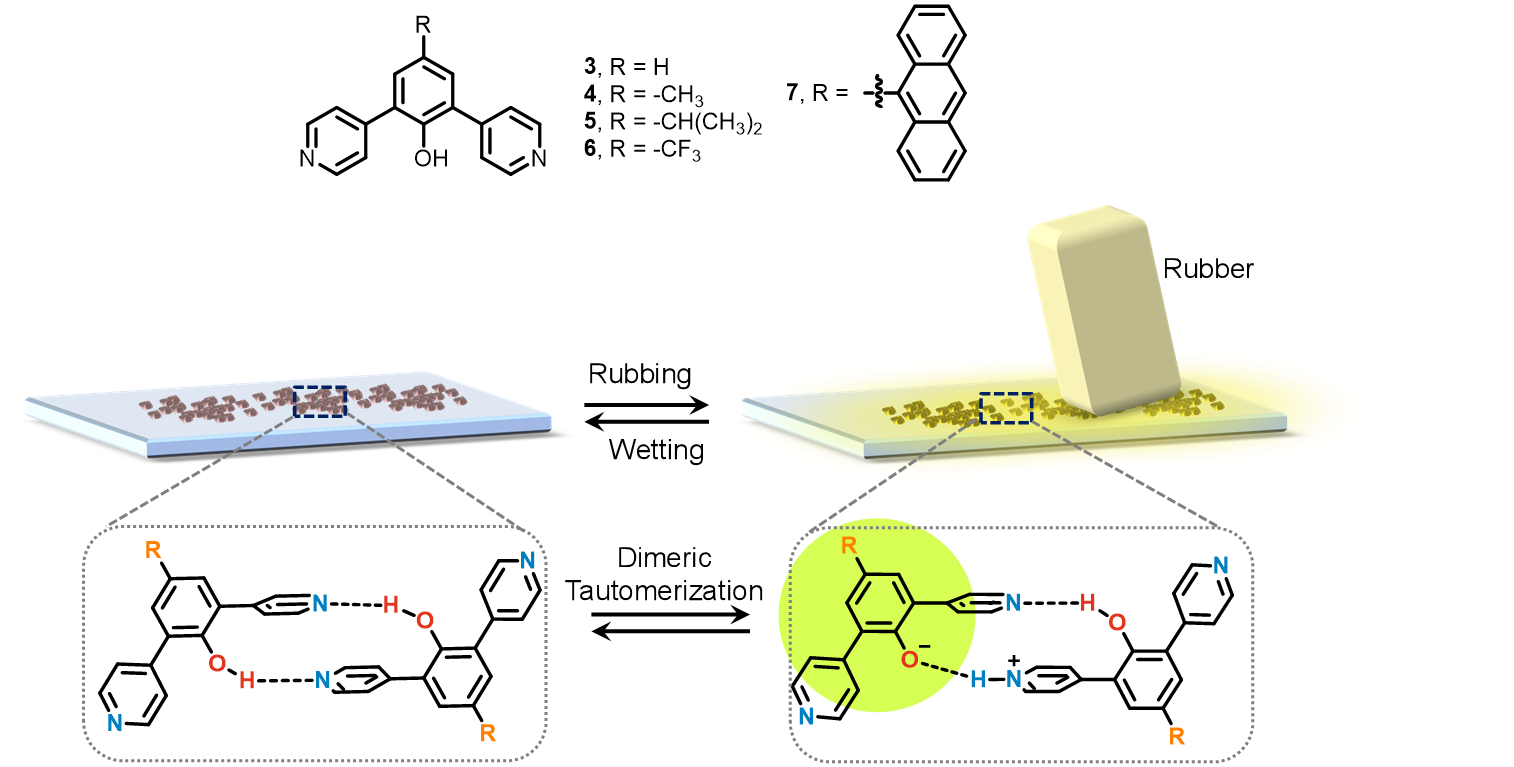 近日,復旦大學的朱亮亮課題組發現一種可以通過雙氫鍵形成雙吡啶苯酚類化合物的交聯體。這種體系能夠在固態穩定存在,并且在橡膠類材料的摩擦所形成的微弱電場的誘導下,雙氫鍵二聚體結構中可以發生質子轉移。這一過程瞬間產生了一種從暗態到明態的互變異構體,從而使材料的熒光量子產率提高了450倍以上,產生固態“點亮”效果。由于互變異構的可逆性,這一類材料可以重復使用,從而開發出加密應用。此外,對結構的進一步修飾可以實現不同的性能拓展,為新一代智能材料的設計開辟了更多的可能性。