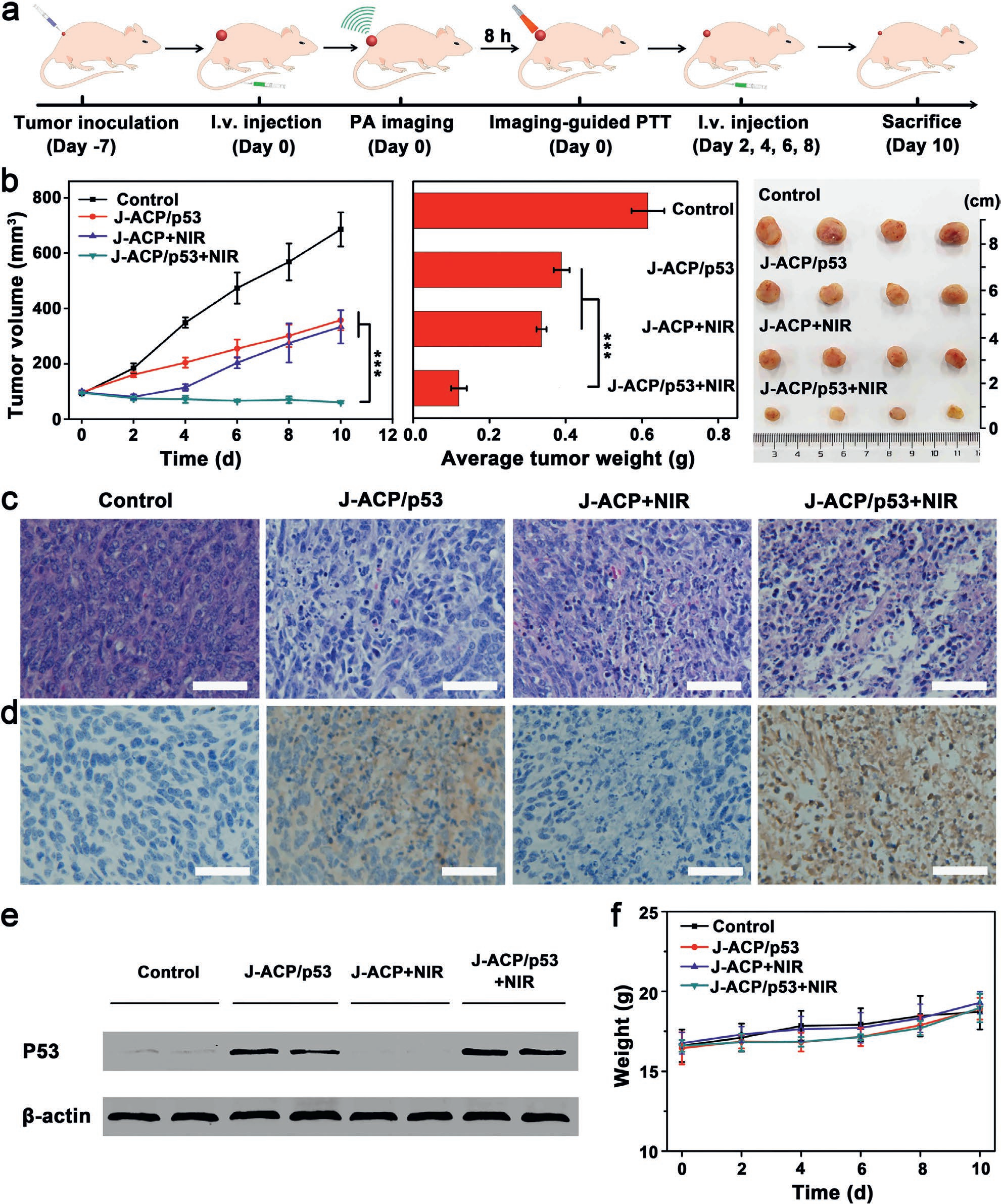 圖4. (a) 動(dòng)物實(shí)驗(yàn)治療過(guò)程示意圖;(b) 瘤子生長(zhǎng)曲線以及治療結(jié)束后的瘤重和腫瘤照片;(c) 腫瘤的H&E染色;(d) 腫瘤的免疫組化;(e) 腫瘤里面P53蛋白表達(dá)的western blot實(shí)驗(yàn);(f) 小鼠的體重曲線。