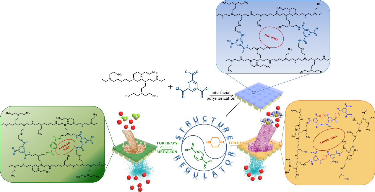 近日,城市水資源與水環境國家重點實驗室成員、哈爾濱工業大學(威海)程喜全副教授研究團隊提出一種聚酰胺納濾膜孔徑精細調節策略,制備出兩種性能優異納濾膜,并分別針對染料廢水和重金屬污染廢水展現出優異的分離性能。該項策略在原界面聚合體系中加入哌嗪單體或者對苯二甲酰氯單體,通過調節交聯孔尺寸與納濾膜表面電荷,實現分離效率優化,獲得性能優異納濾膜。