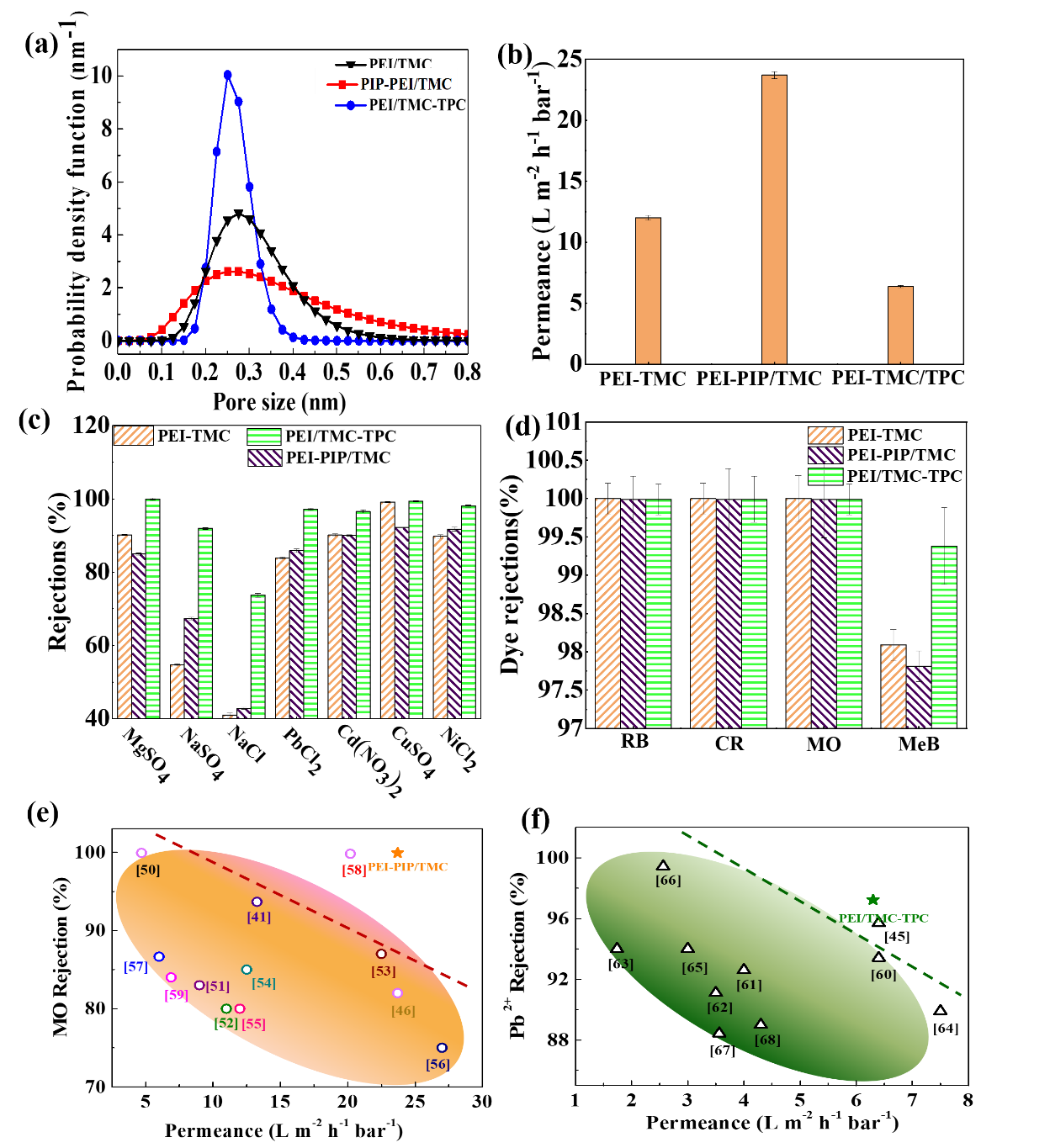 圖2 (a)三種復合NF膜的孔徑分布;(b)三種復合NF膜的純水滲透率;(c)PEI-PIP/TMC膜對不同染料的截留率;(d)PEI/TMC-TPC膜對不同離子的截留率;性能對比圖:PA膜(e)對MO染料的分離;(f)PA膜對PbCl2的分離