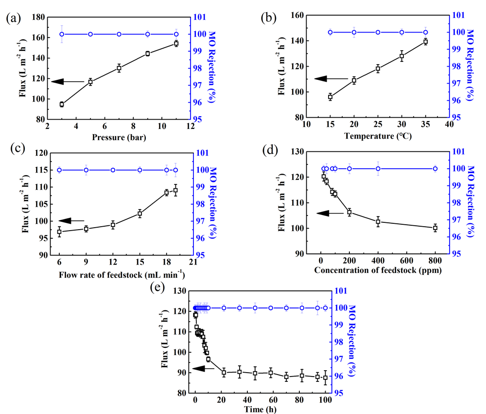 圖4 操作條件對PEI-PIP/TMC膜分離甲基橙染料性能的影響:(a)過濾壓力;(b)系統溫度;(c)原料的流速;(d)進料濃度;(e)PEI-PIP/TMC膜的長期性能
