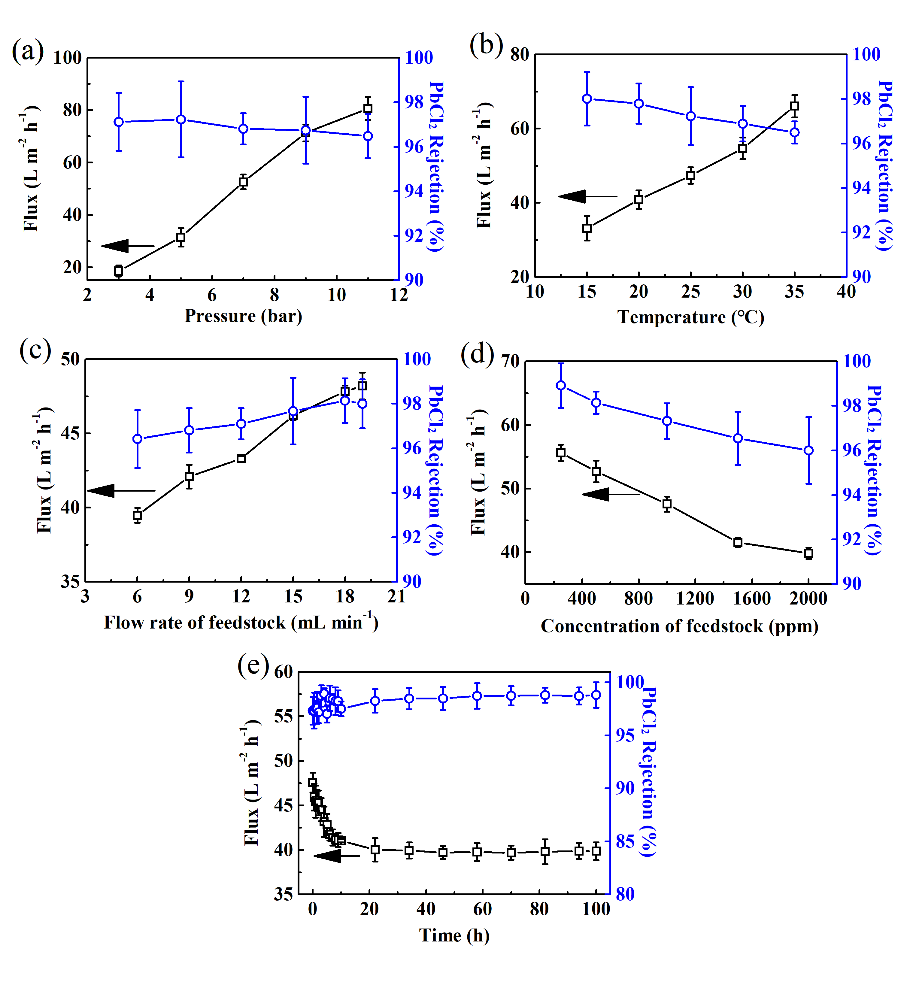 圖5 操作條件對PEI/TMC-TPC膜分離PbCl2溶液性能的影響:(a)過濾壓力;(b)系統溫度;(c)原料的流速;(d)進料濃度;(e)PEI/TMC-TPC膜的長期性能