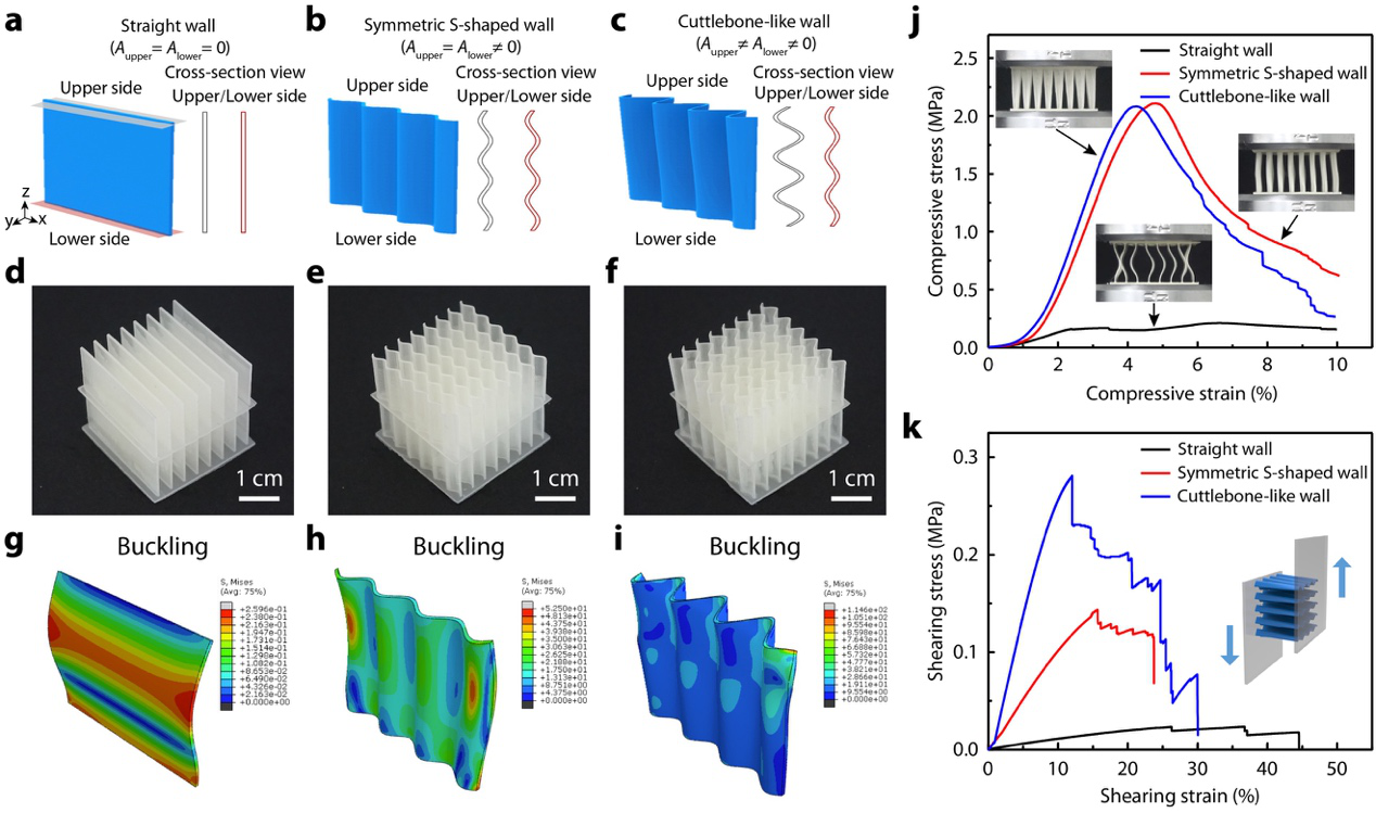 圖2:仿生模型的制備、測試及模擬。(a-c) CAD設計的仿生模型;(d-f)3D打印模型的光學圖;(g-i) 仿生模型的有限元模擬;(j, k) 壓縮與剪切測試結果。