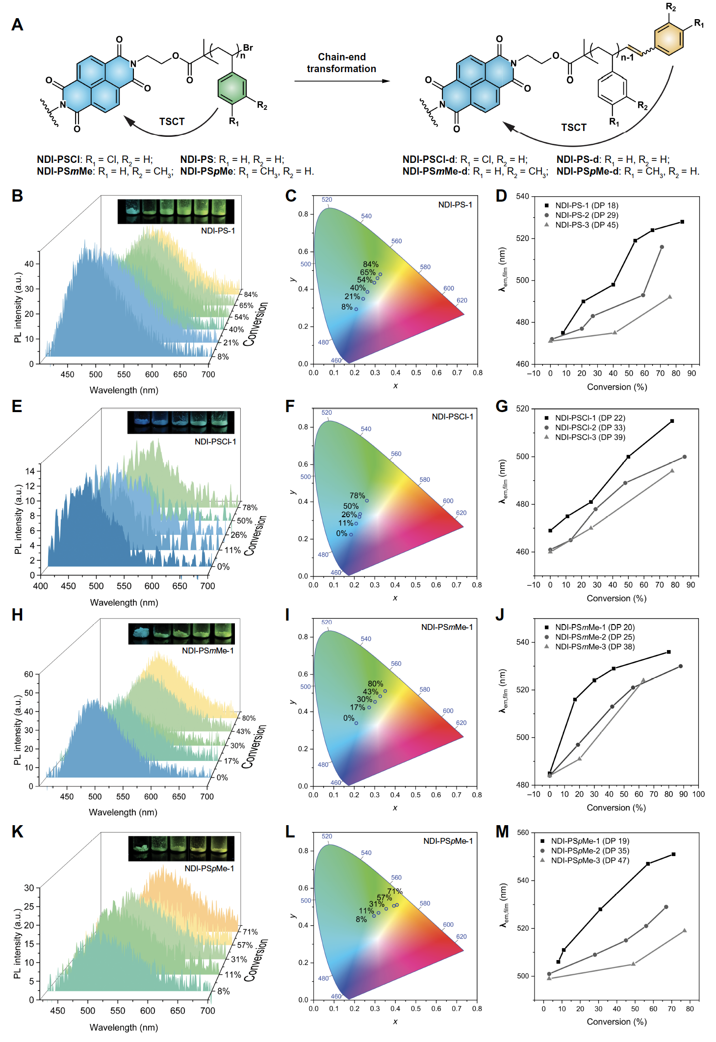 在聚合過程中,作者偶然觀察到了一個預料之外的黃色熒光的出現,經過仔細分析實驗結果后發現這是由于ATRP聚合物的脫溴化導致的。新產生的乙烯基苯端基會與萘二酰亞胺發生更強的TSCT作用,從而產生一個新的激發能態,引起熒光的紅移。這個現象表明,即使沿聚合物主鏈距離較遠,供受體基團在聚集態仍然可以產生有效的電荷轉移過程。作者進一步利用一系列端基改性工程確認了這一現象,四種類型的聚合物均可通過控制端基轉化率達到發光波長紅移的效果,實現從藍光到黃光的轉變(Figure 1)。