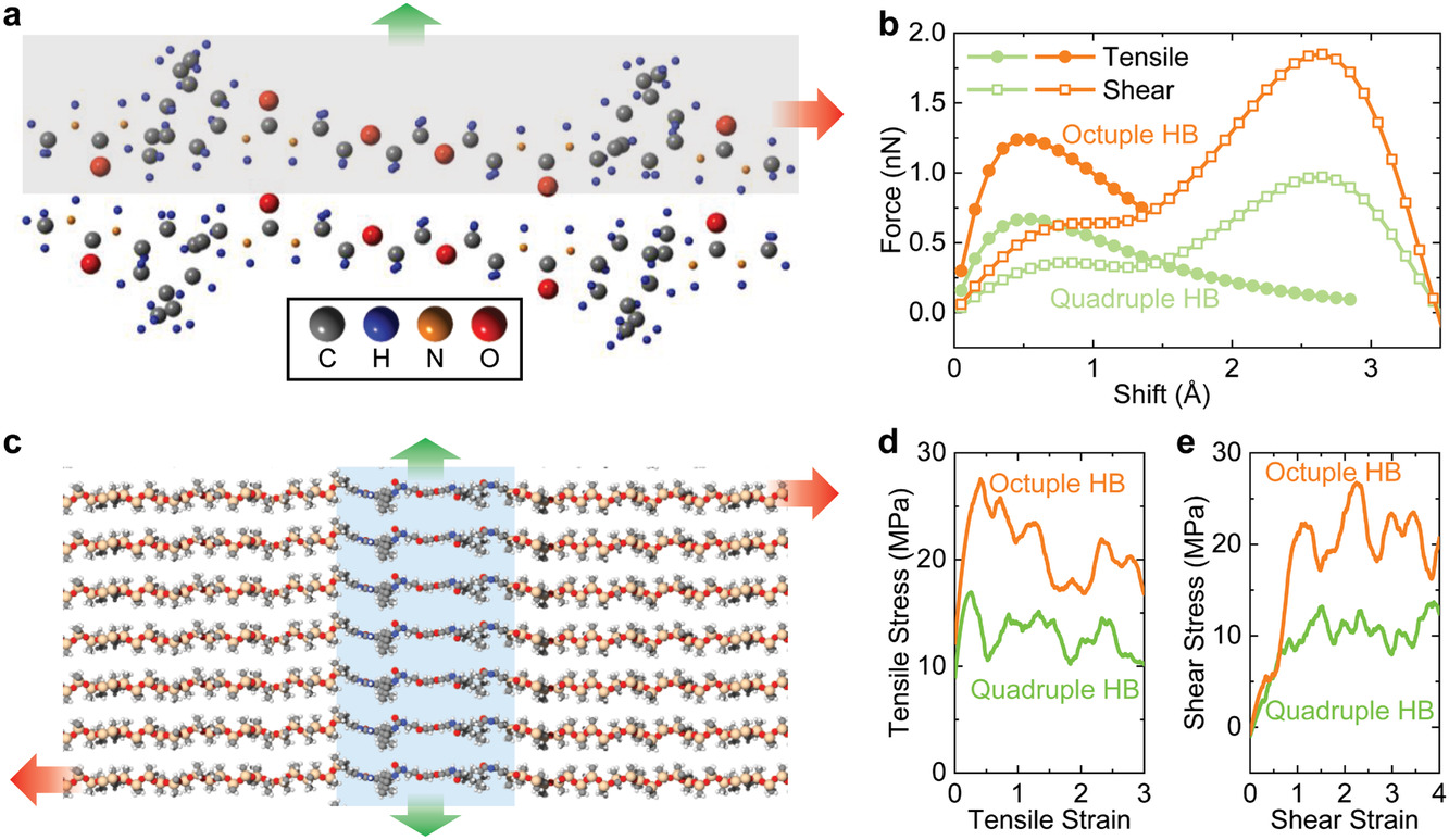 氫鍵及氫鍵域在之前的眾多研究中已被證實(shí)能夠大幅度提高韌性,而該項(xiàng)工作中之所以有如此高的力學(xué)性能,還依賴于八重氫鍵的強(qiáng)度。為了探究八重氫鍵的作用,該工作運(yùn)用DFT對(duì)八重氫鍵的強(qiáng)度進(jìn)行了模擬分析,并運(yùn)用分子動(dòng)力學(xué)模擬所形成氫鍵域的強(qiáng)度(圖3)。強(qiáng)度的大幅度提高對(duì)氫鍵增韌增強(qiáng)機(jī)制有著放大作用,在應(yīng)力下能夠更好抵御應(yīng)變及耗散更多的能量。