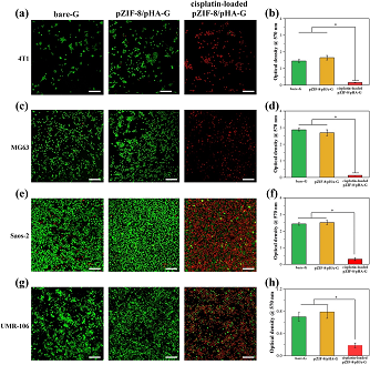 圖5. 體外腫瘤細(xì)胞與支架共培養(yǎng),評估負(fù)載順鉑的pZIF-8/pHA-G支架對不同腫瘤細(xì)胞增殖的抑制作用。