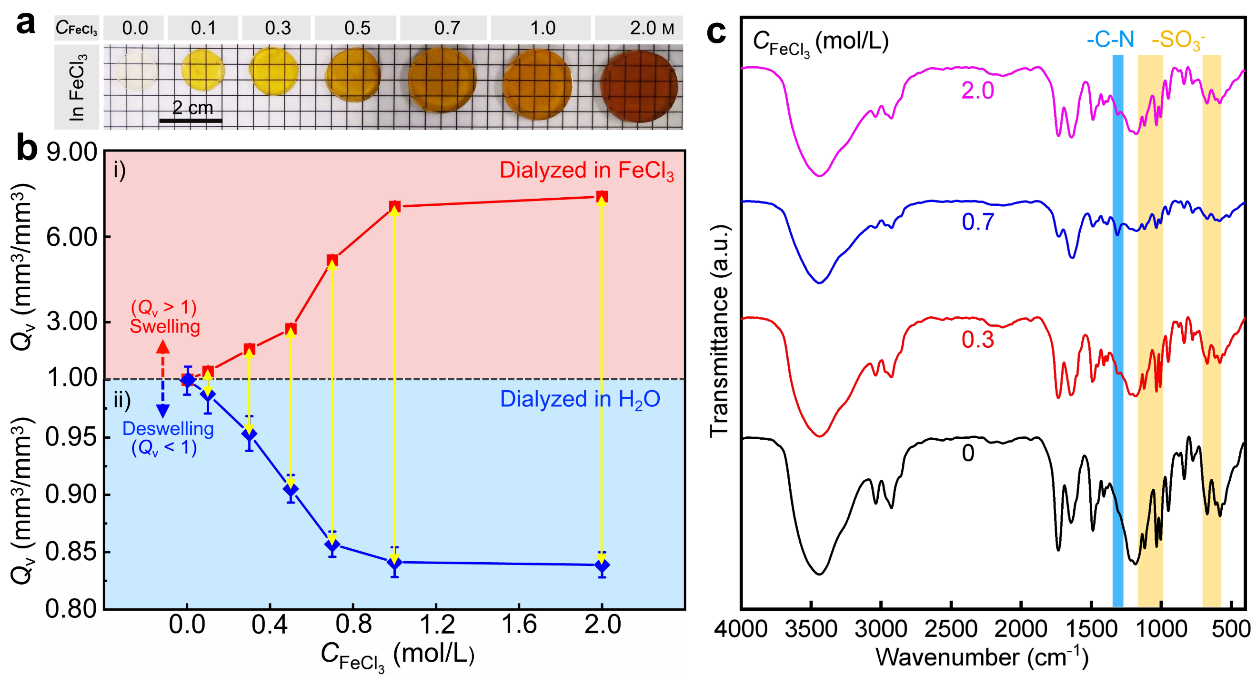 圖3 透析溶液濃度(CFecl3)對所形成PA水凝膠的溶脹行為和紅外光譜的影響:a)在不同濃度的FeCl3透析溶液中浸泡后ASP-PA-Fe3+水凝膠樣品的宏觀照片;b)ASP-PA-Fe3+水凝膠和WEQ-PA-Fe3+水凝膠樣品的體積溶脹比(Qv)隨CFecl3的變化圖(其中黃色雙箭頭實線表示在兩種透析介質中Qv的變化);c)WEQ-PA-Fe3+水凝膠樣品的紅外光譜圖。
