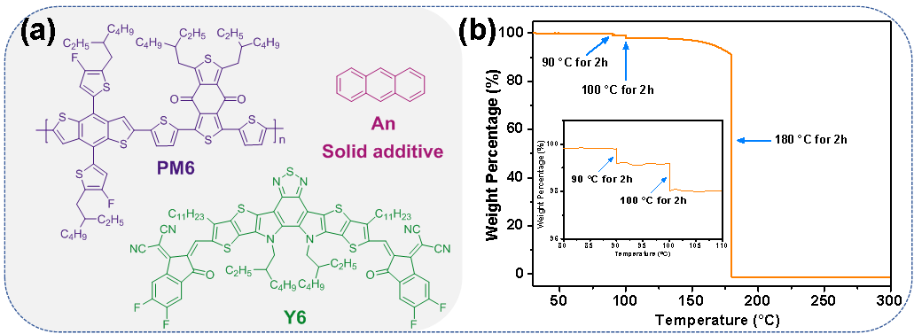 Figure 1. (a) Chemical structures of PM6, Y6, and anthracene. (b) TGA plot of anthracene at a scan rate of 5 °C min?1 under inert atmosphere.