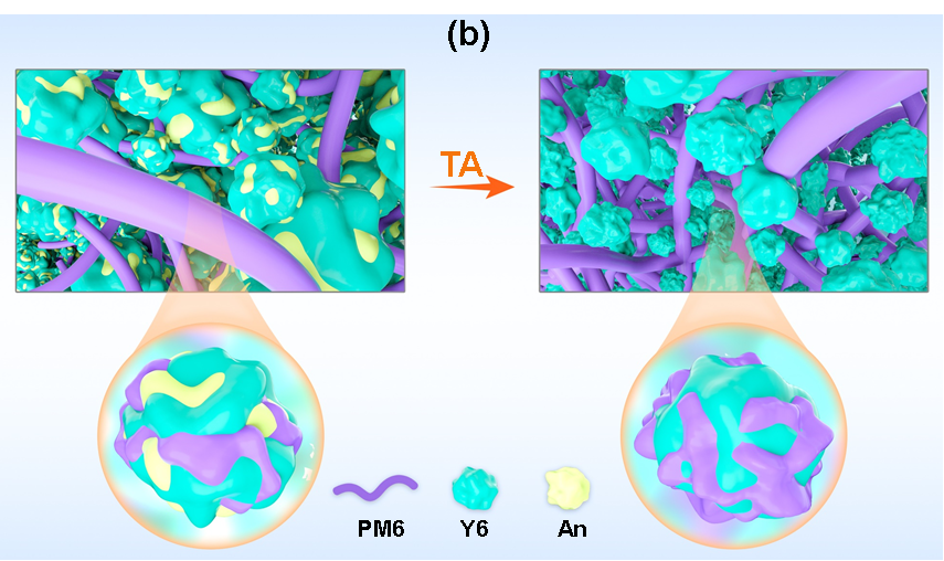 調控有機半導體材料的聚集尺寸以形成均勻的納米尺寸相分離形貌結構,是制備高性能聚合物太陽能電池器件的關鍵。與富勒烯受體材料不同,目前廣泛使用的稠環非富勒烯給體材料具有較強的自聚集特性以及與給體材料類似的p-共軛結構,增加了形貌優化的難度。并且,目前稠環非富勒烯體系的形貌調控方法大都沿用于富勒烯體系,難以滿足稠環非富勒烯材料的結構特性,極大限制了光伏性能的提升。