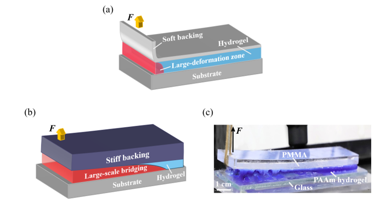 水凝膠的粘接性能強弱有著重要意義;近年來水凝膠強粘接的實現顯著拓展了其應用范圍。人們常用90度剝離測試用于表征水凝膠粘接性能的強弱。剝離過程中剝離力通常會先增加到一個峰值后再進入一個穩定剝離狀態。穩態剝離力決定了水凝膠的粘接韌性,而比粘接韌性更高的最大剝離力決定了其抗脫粘性能。但是,這一特性在以前往往被忽略掉了。