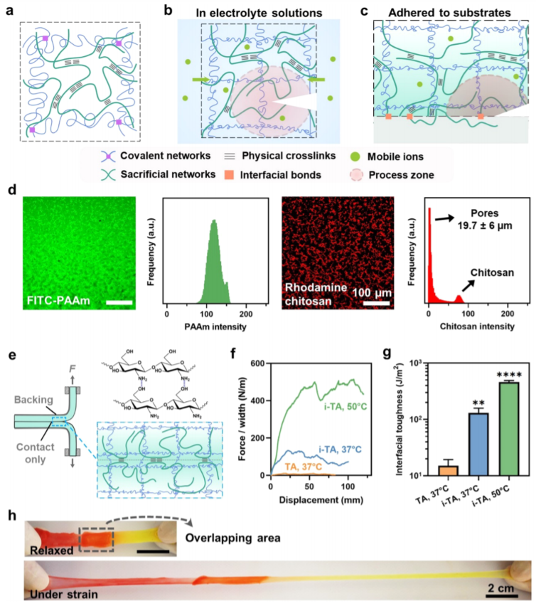 這項工作提出的主要涉及原則是,通過在可拉伸的網絡中穿插由富含氨基的聚合物物理交聯形成的耗散網絡。這種設計的好處是:(1) 物理交聯的耗散網絡增加韌性,而可拉伸網絡提供可拉伸性;(2) 網絡組成不依賴離子,因此生成的凝膠物理化學性質穩定,不受環境中的離子影響; (3) 富含氨基的聚合物天然具備多功能,比如自我交聯、粘接性和抗菌功能。基于這些考量,該團隊選擇了經典的聚丙烯酰胺 (PAAm) 形成可拉伸網絡,使用氫鍵交聯的殼聚糖 (chitosan) 作為耗散網絡。