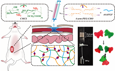 針對上述臨床問題和需求,青島大學轉化醫學研究院周祺惠特聘教授團隊/附屬醫院普外科盧云主任團隊基于席夫堿反應開發了一種生物多功能羧甲基殼聚糖(CMCS)和四臂聚(乙二醇)醛(4-arm-PEG-CHO)水凝膠補片用于全層腹壁缺損修復。所設計和制備的水凝膠表現出優異的自愈性和機械性能,在濕態下具有高粘附力,以及顯著的抗菌能力。另外,體外細胞實驗表明,所制備的水凝膠加載重組牛堿性成纖維細胞生長因子(rb-bFGF)后可以顯著促進細胞增殖和遷移,進而加快了大鼠模型中全層腹壁缺損修復。組織形態學實驗表明,與臨床常用的商品化PP補片相比,所開發的水凝膠補片能夠通過上調 Ki67的產生促進腹壁組織的修復和增厚,誘導膠原蛋白和新生血管形成,同時可以通過減少IL-6、TNF-α和IL-1β的表達來抑制炎癥。這些結果表明,這種新型生物多功能水凝膠補片在治療全層腹壁缺損方面具有巨大潛力。