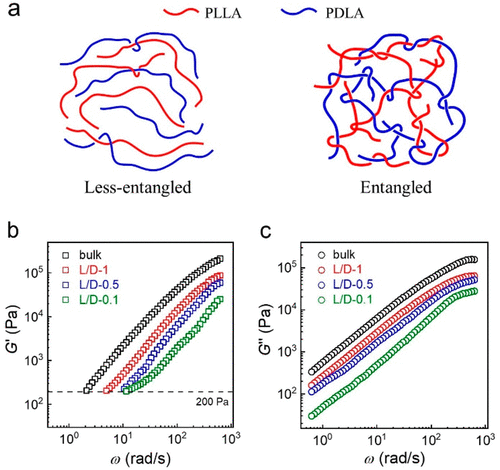 圖1 冷凍干燥和溶液澆鑄PLLA/PDLA共混物在熔體中的鏈結(jié)構(gòu)示意圖和流變測試結(jié)果
