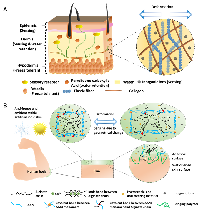在這些傳感材料中,以離子水凝膠為代表的軟材料,由于其優異的生物兼容性,更加接近生物組織的機械和電學特性,近年來收到了大量關注。然而,目前離子水凝膠在低溫環境容易結冰而失去變形能力和導電性;同時,傳統離子水凝膠通常不具備良好的表面粘附能力, 從而影響其在可穿戴和軟體機械人等大變形應用場景中的使用;此外,傳統離子水凝膠在環境中易失水的問題也亟待解決。