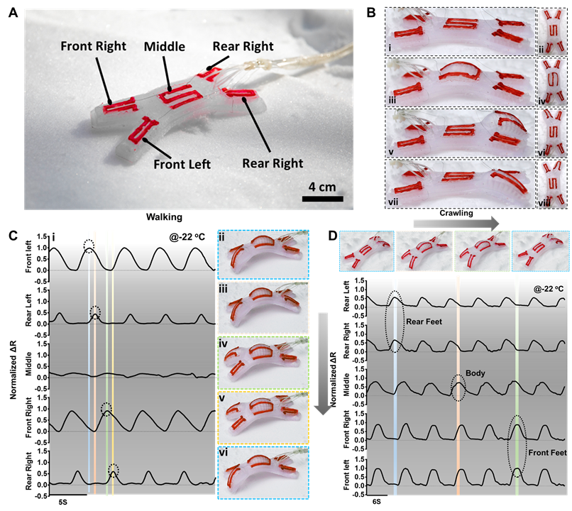此外,鑲嵌了iSkin傳感器的四足軟體機器人能夠在極寒環境中感知機器人的爬行或者走路狀態 (圖4) 。