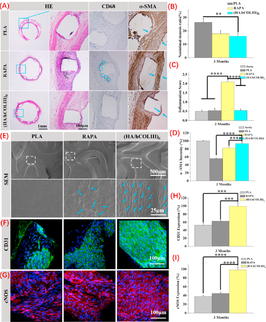 圖4. (A)對植入支架周圍組織進行HE、CD68、α-SMA免疫組化染色分析;(B)血管狹窄率; (C) 不同組織的炎癥評估; (D)組織中α-SMA的相對強度; (E)組織內部的SEM圖; (F) CD31 表達;(G)新生內膜表面eNOS表達; (H, I) CD31和eNOS在新生內膜表面的定量分析。