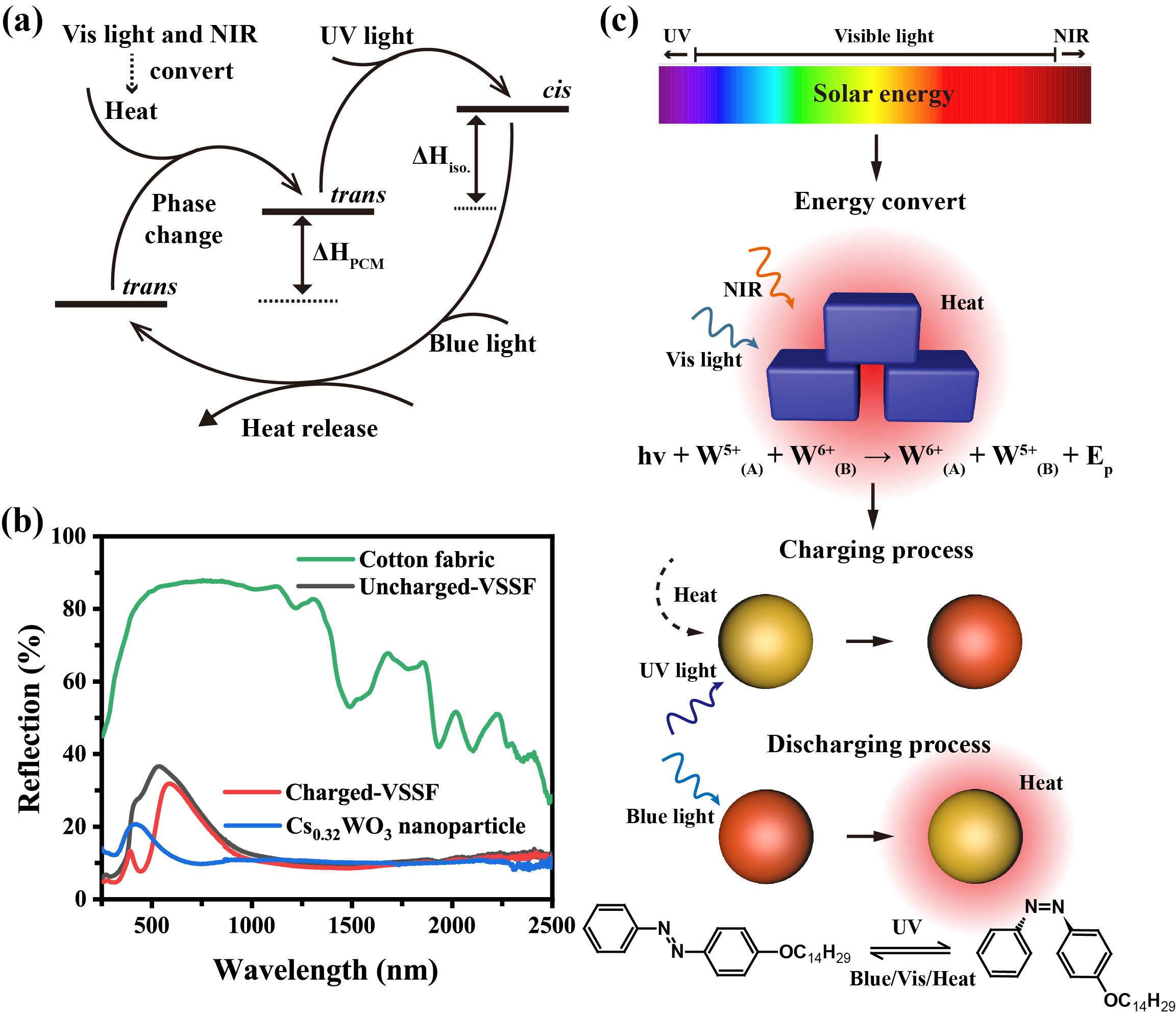 圖1 (a)UV-vis-NIR 太陽能光譜吸收、儲存以及釋放系統;(b)UV-vis-NIR反射率光譜;(c)太陽能吸收轉化過程。