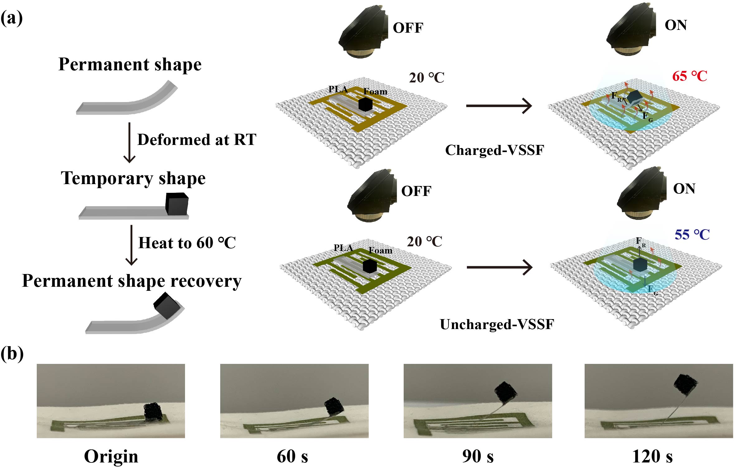 有趣的是通過調節刺激響應光的強度,可以用于構建一個光熱起重器。通過PLA形狀記憶材料具有熱致形變的性能(響應溫度為60 ℃),設計VSSF對PLA進行有效控制形變,而這個形變可以作為一種力將重物抬起。在模擬太陽光(AM1.5,80 mW cm-2)刺激下,充能和未充能狀態下VSSF的發熱溫度不同,分別為65 ℃和55 ℃。因此充能后的VSSF在太陽光刺激下能夠激發PLA產生形變回復,從而舉起自身3倍重量的物體,實現光熱驅動(圖3和視頻1)。