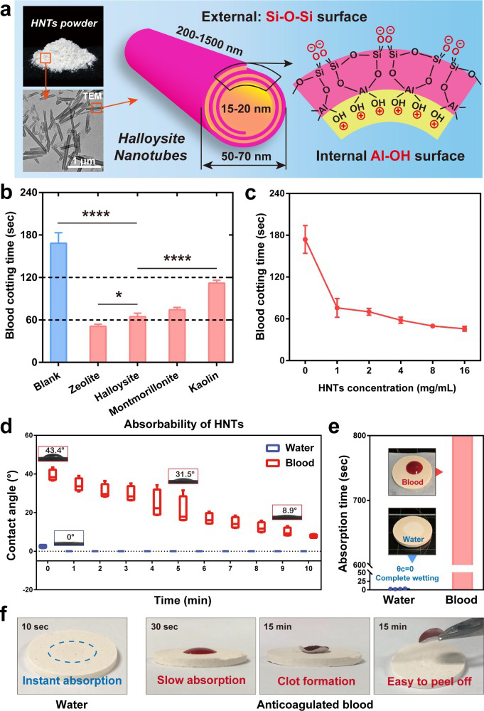 研究發(fā)現(xiàn),HNTs的促凝血能力介于沸石和蒙脫土之間,約為高嶺土的2.3倍。且具有濃度依賴性。這首先是由于HNTs的超親水性和強(qiáng)吸水率,快速濃縮血液成分引發(fā)凝血。此外,研究人員也發(fā)現(xiàn)HNTs的吸水率接近沸石的吸收率(約其自身體積的80%),明顯高于蒙脫土和高嶺土。
